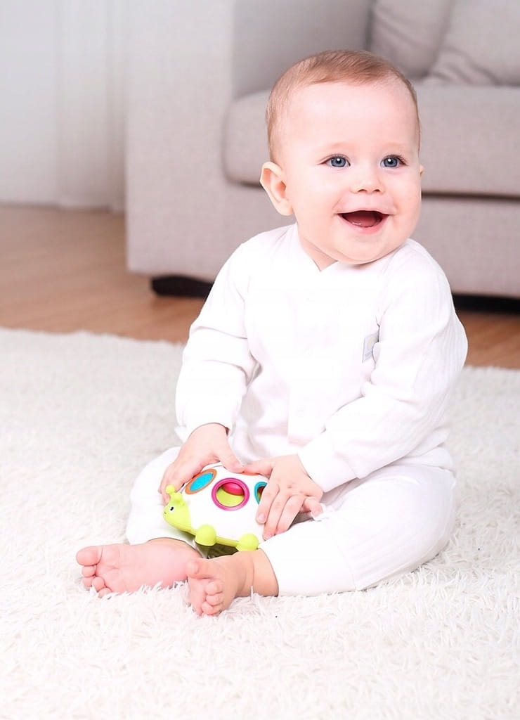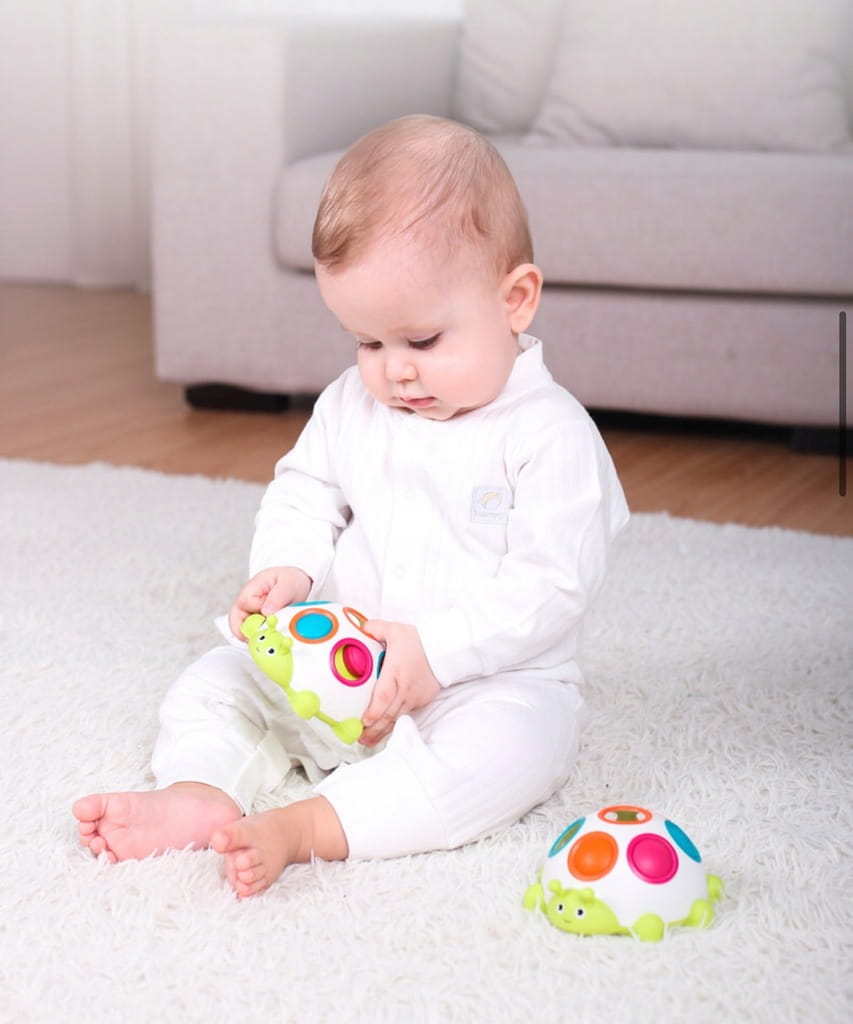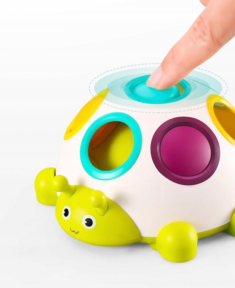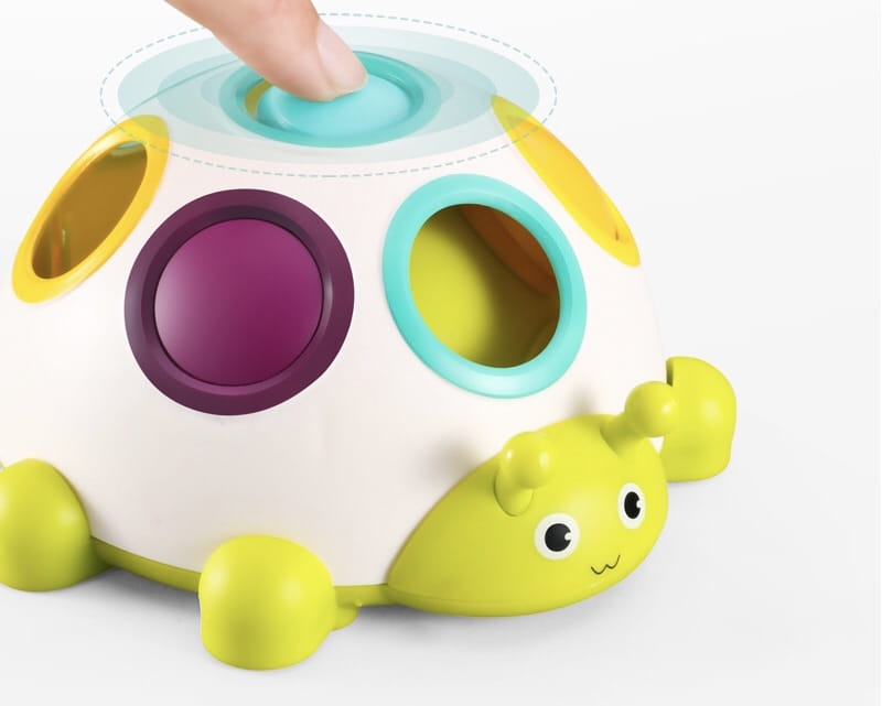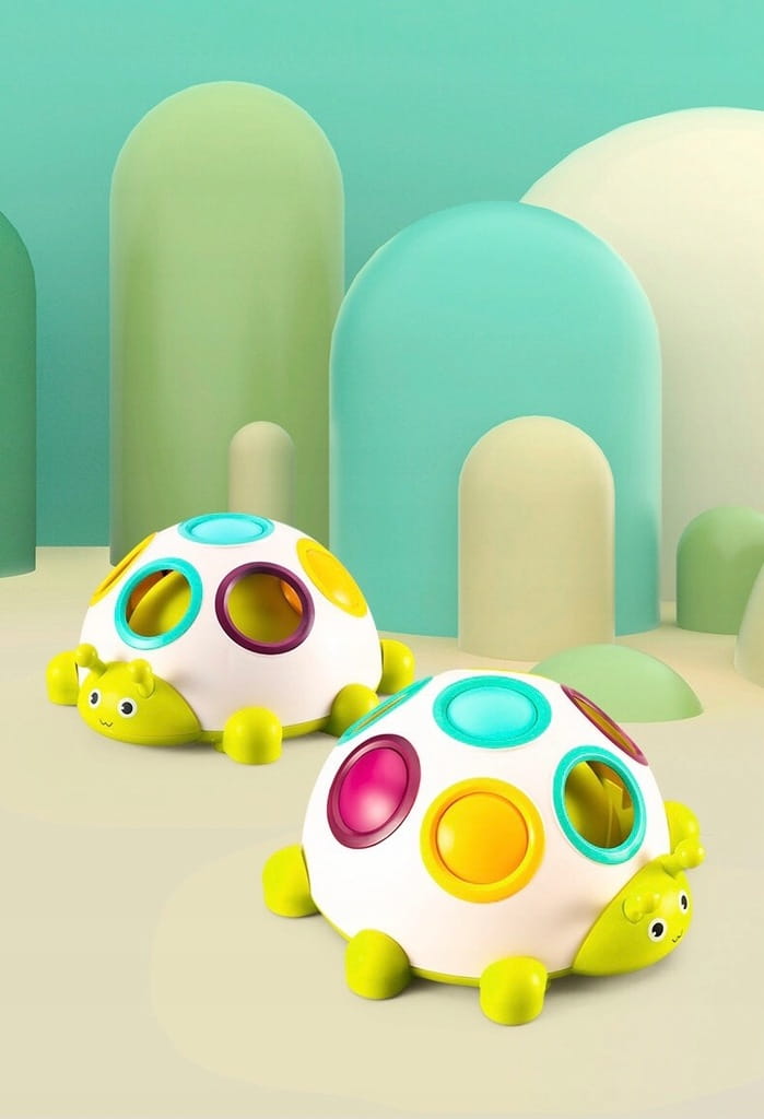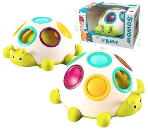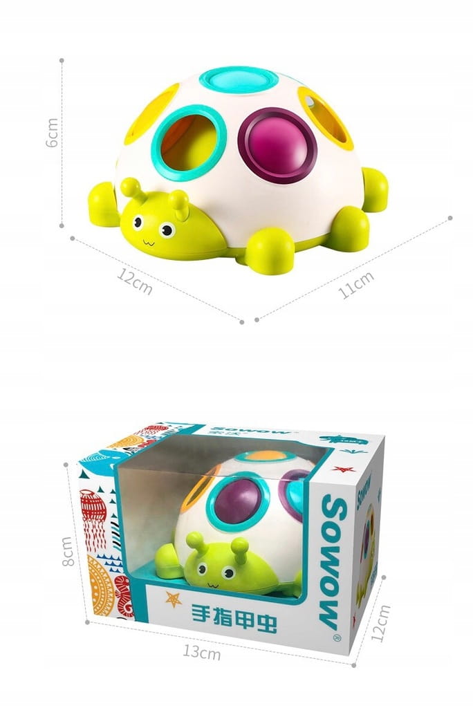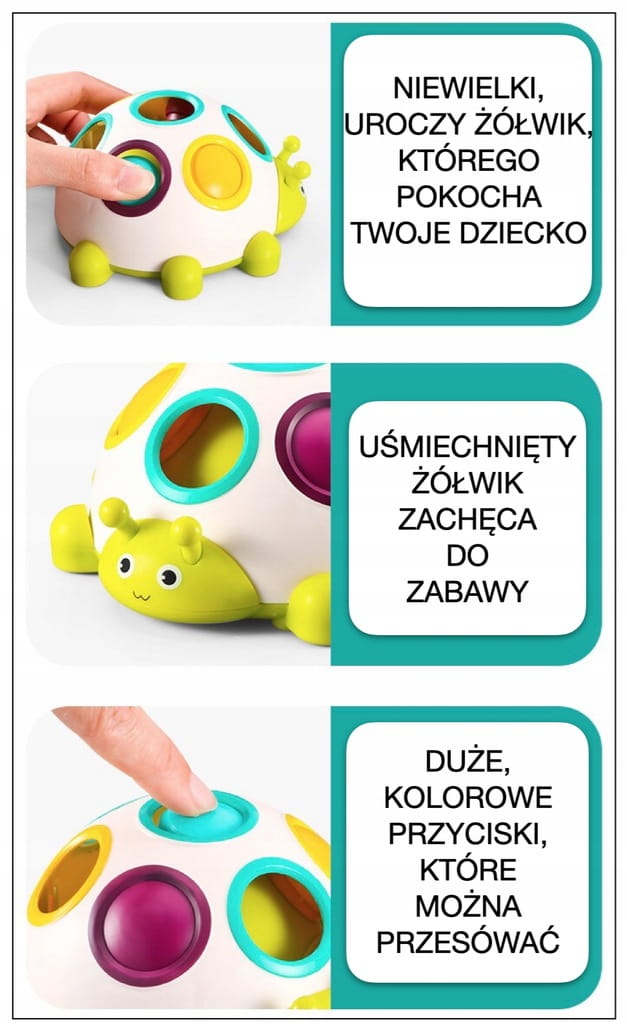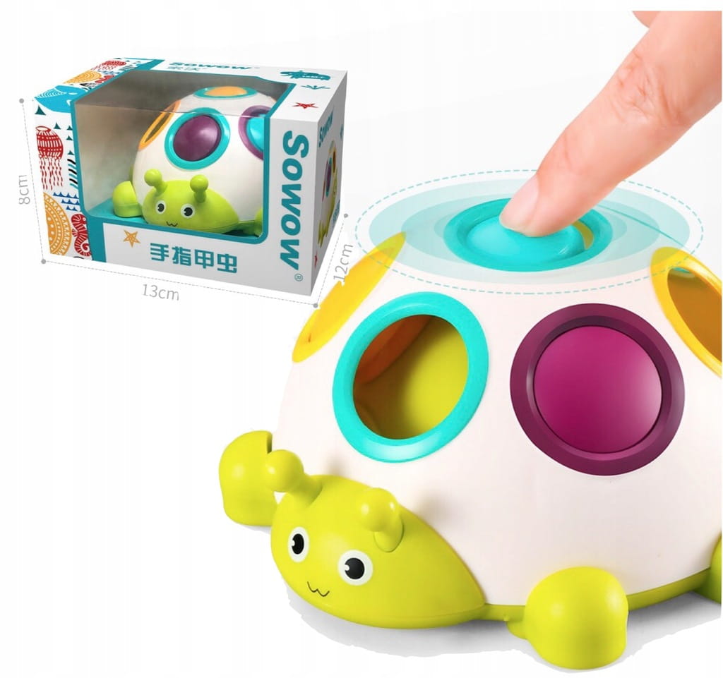 ✅ zadaniem dziecka jest powkładać przyciski do odpowiednich otworów tak, aby odpowiadały kolorom na plecach gąsienicy,