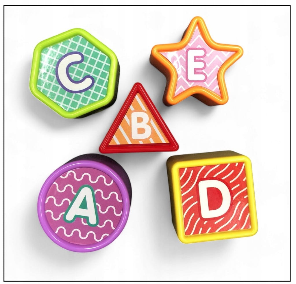 - klocki o różnych kształtach i kolorach, wkładane do ślimaka przez muszlę,