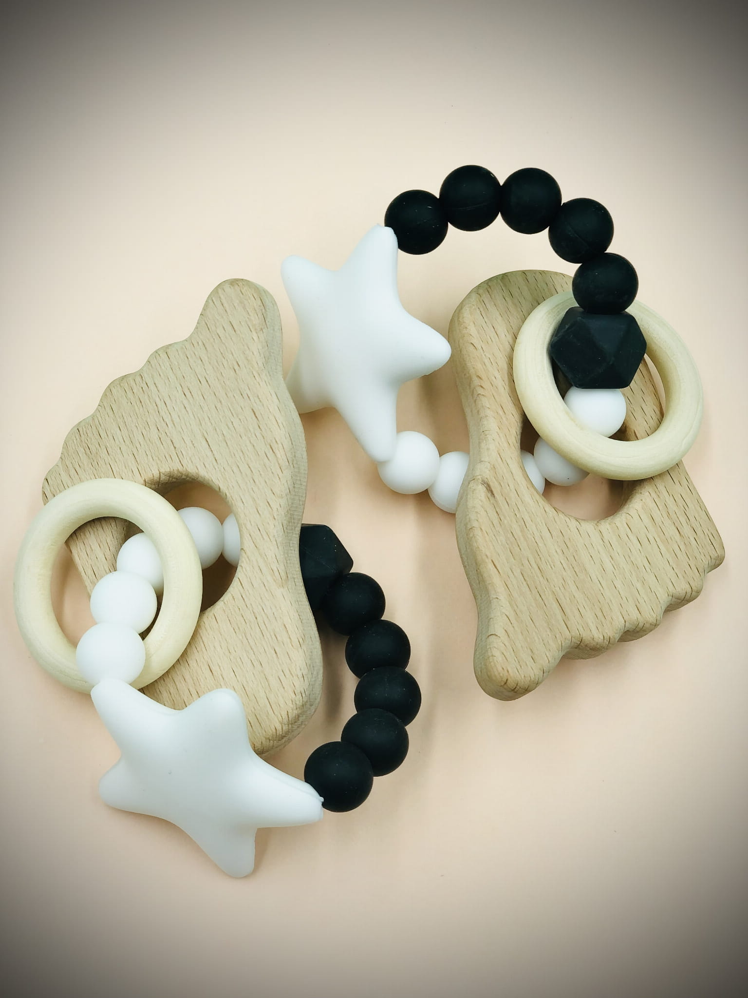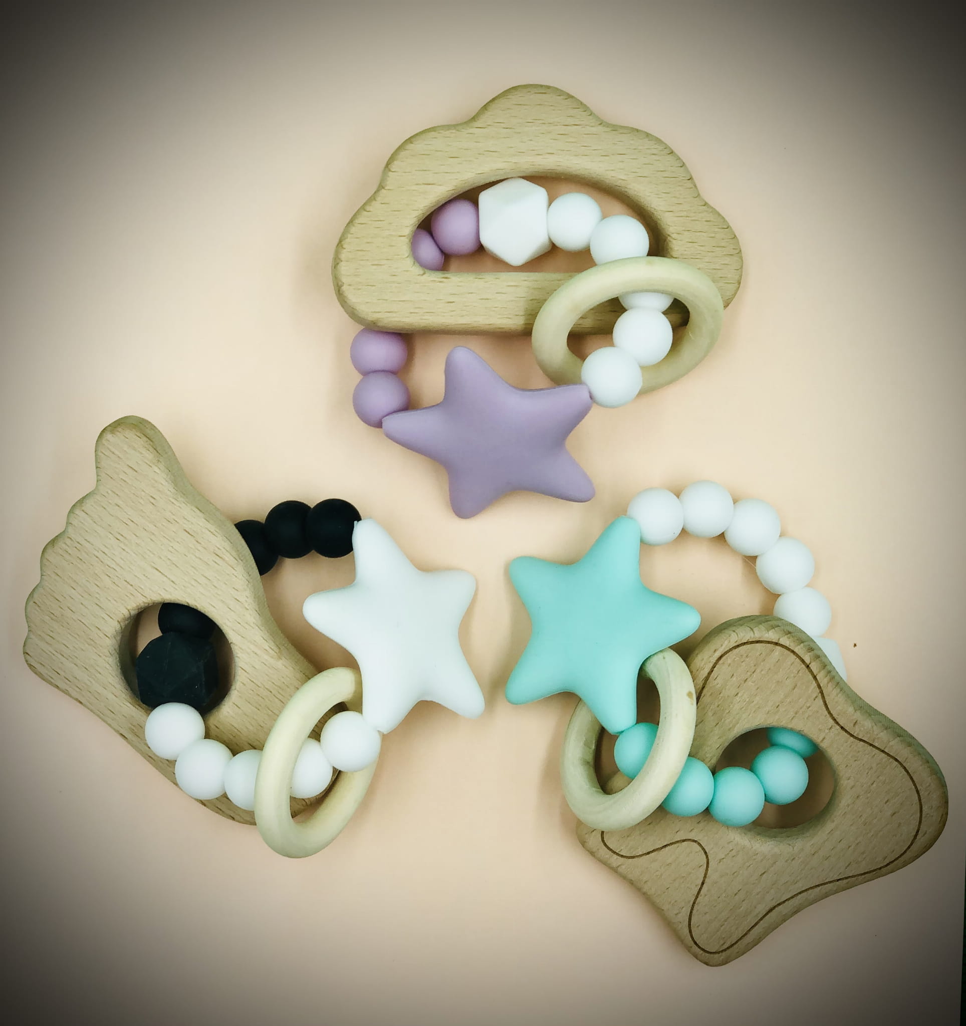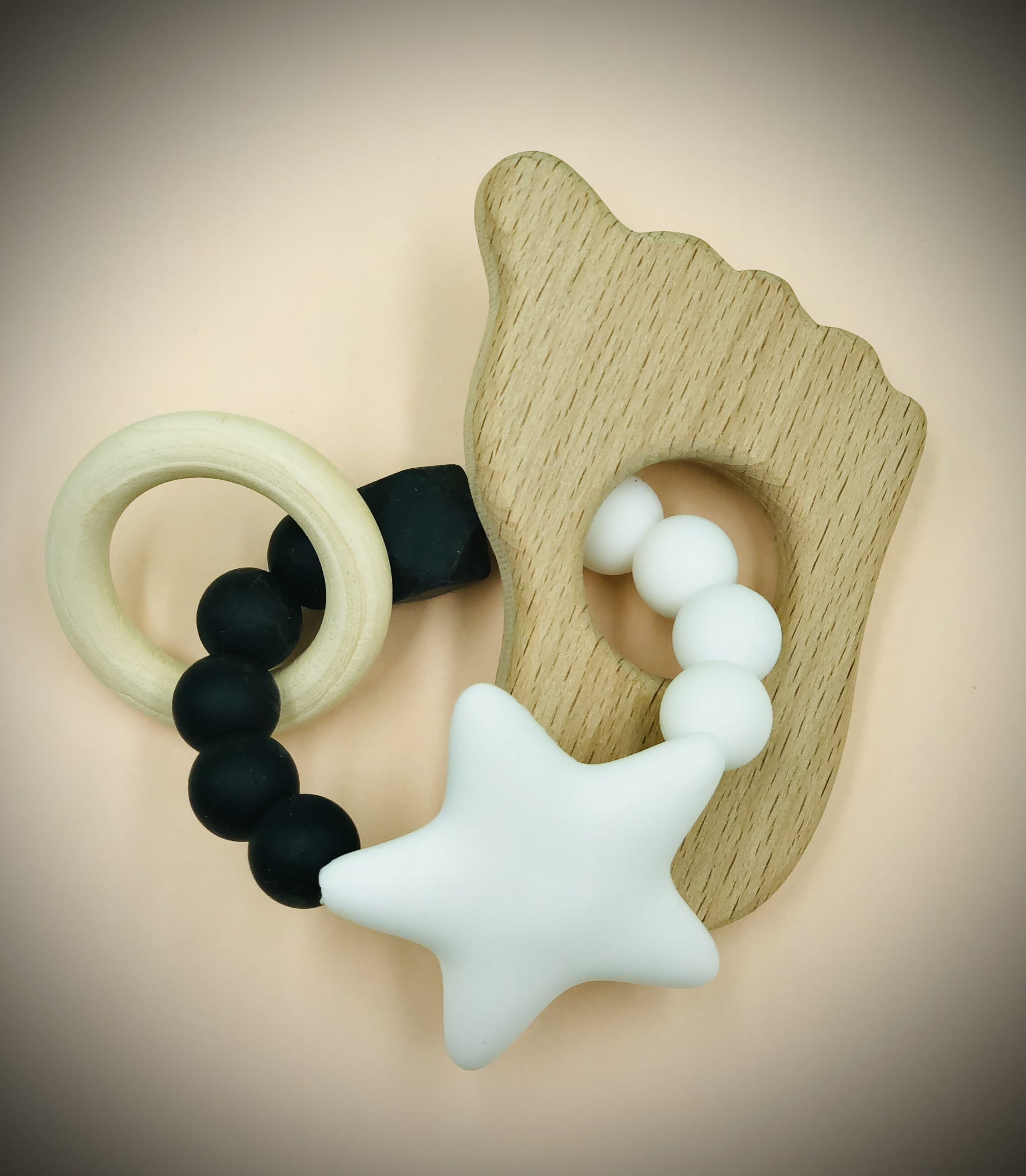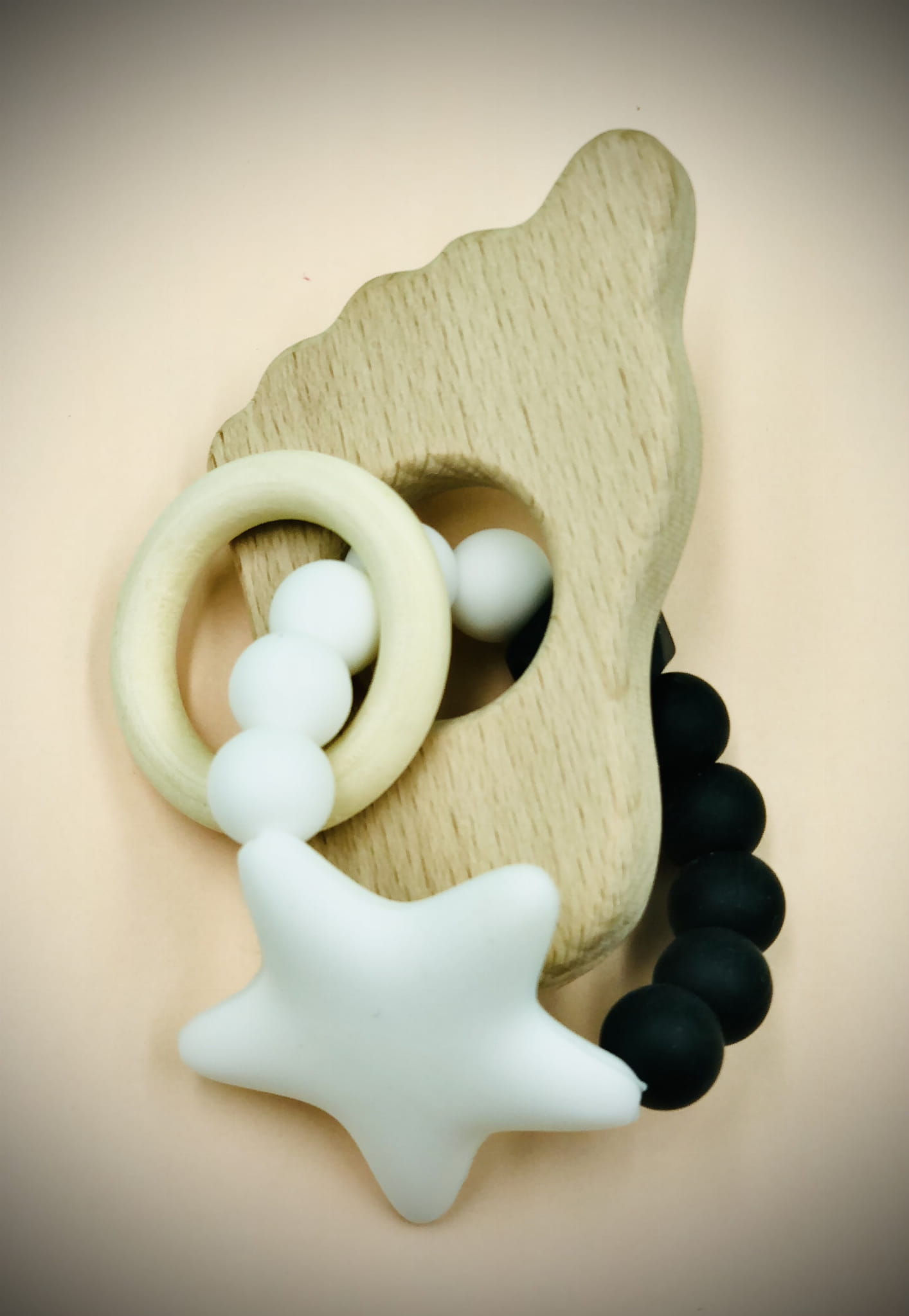 Element stópki i kółeczko wykonane są z drewna bukowego. Koraliki oraz gwiazdka z bezpiecznego dla dzieci silikonu. Precyzyjne wykonanie i estetyka produktu zachwyci każdą mamę i jej maleństwo.